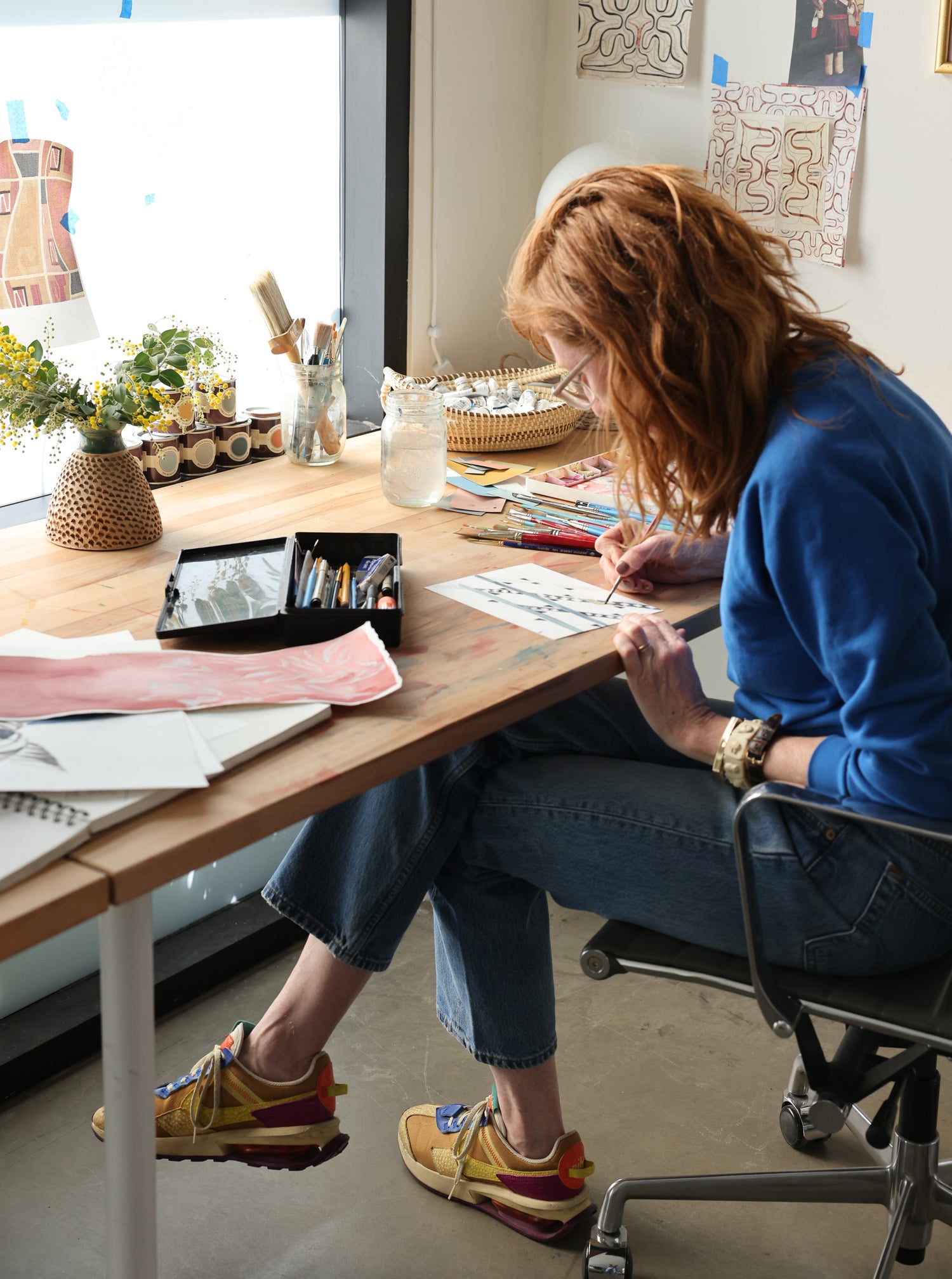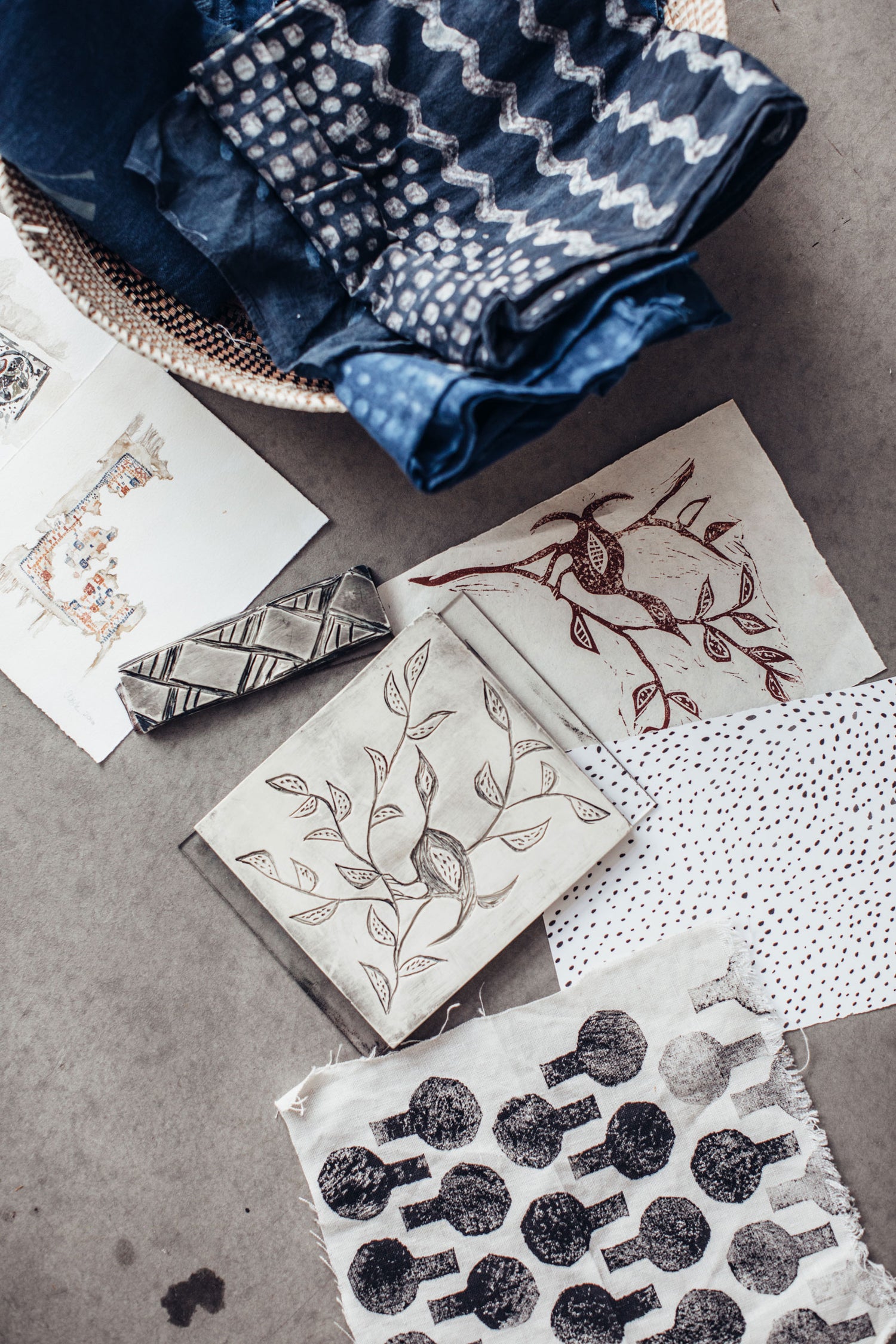 Everything starts in our studio, where we paint sketches, hand-carve blocks or hand-cut stencils before transforming each pattern into an original fabric design.