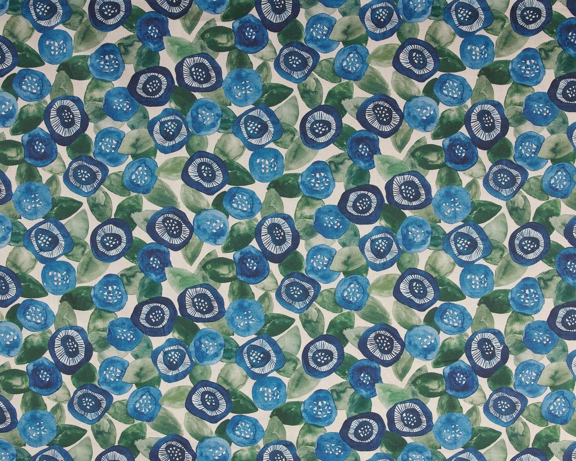 Brook developed this close pattern based on a beautifully preserved fossil print of lotus seed pods dating back several millennia. Found in ponds, they are the heart of every blossom. Bloom is hand-painted with alternating concentric circles and interlocking leaves in dark and light shades. The resulting organic composition is intricate, layered, and optimistic. Printed in deep lapis blue and viridian green on natural Irish linen.