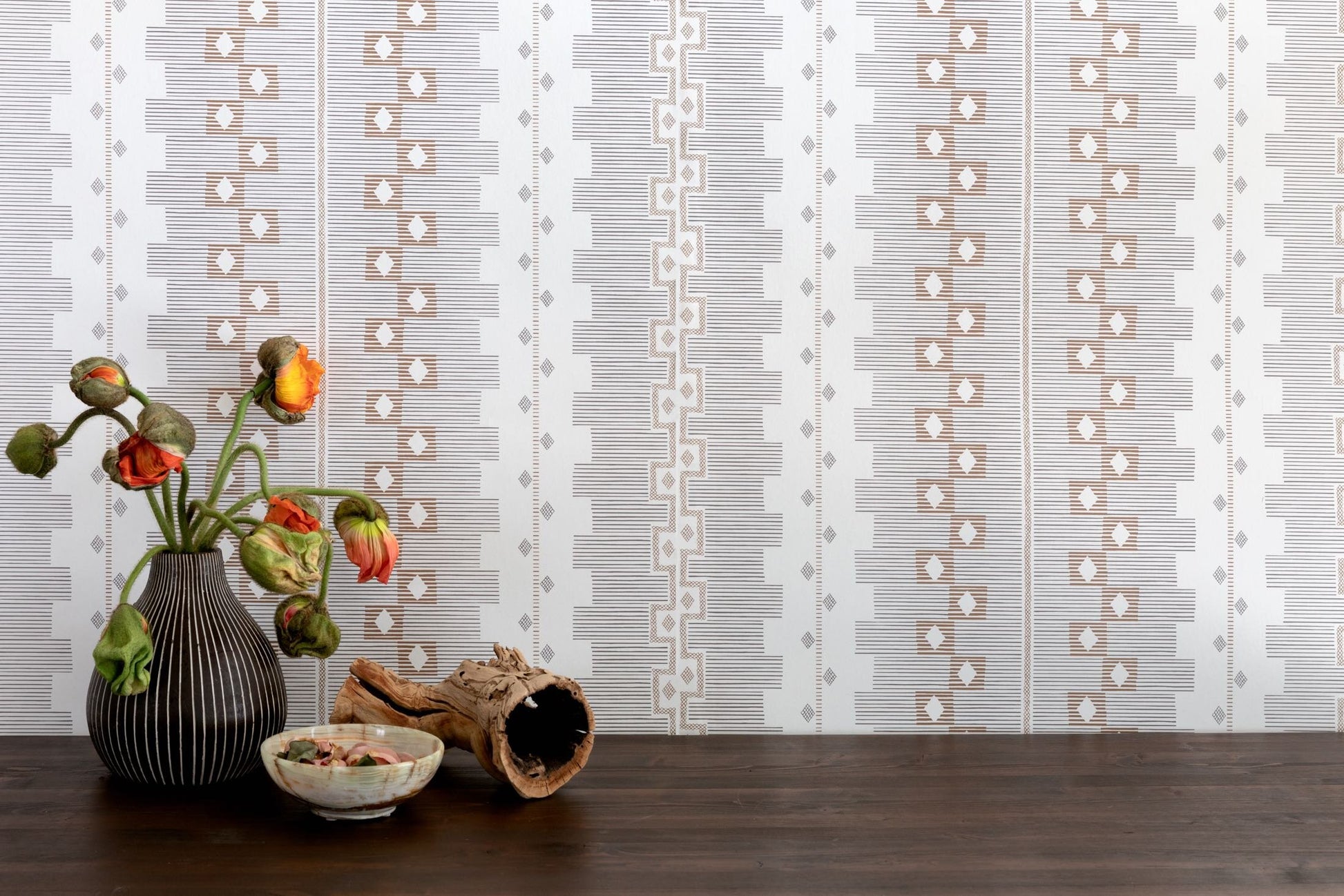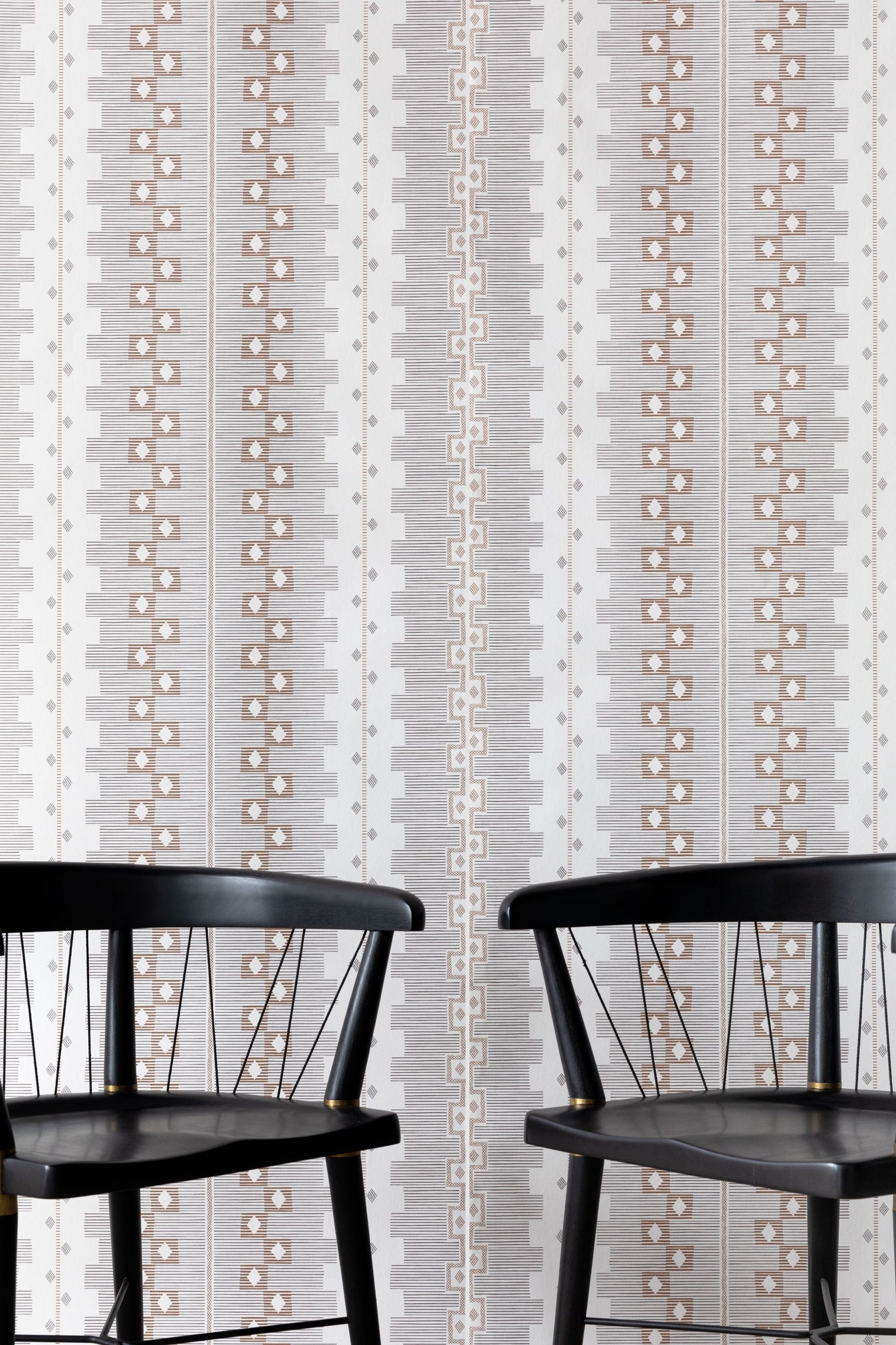 CUSCO travels across time and place, charting a course from ancient Inca textiles and Greek keys to the modern day painting of Cuban-American artist Carmen Herrera. Positive and negative space bring one another into balance, creating a series of geometric stripes. Printed in colors reminiscent of a birch tree: white, ash grey + brown.