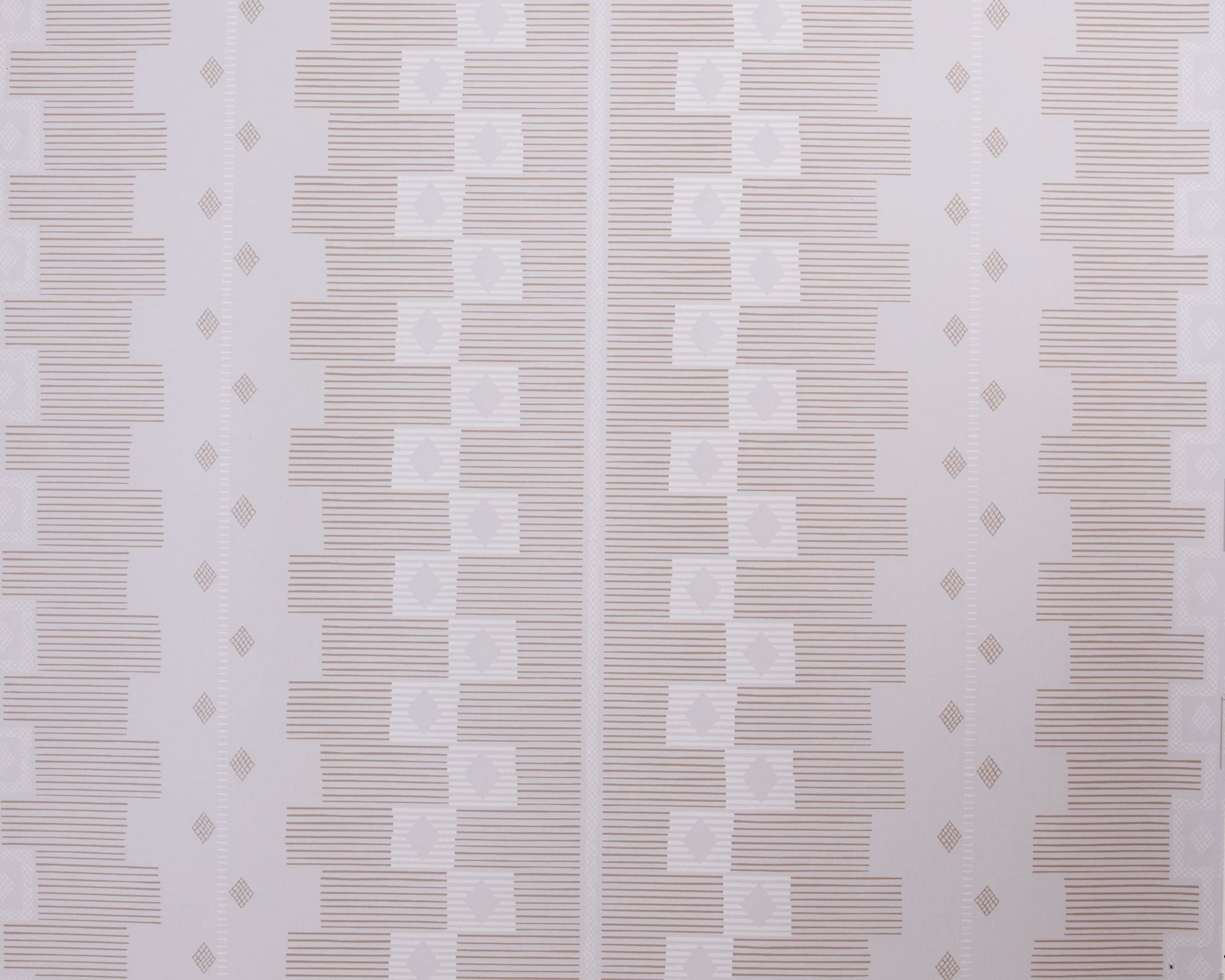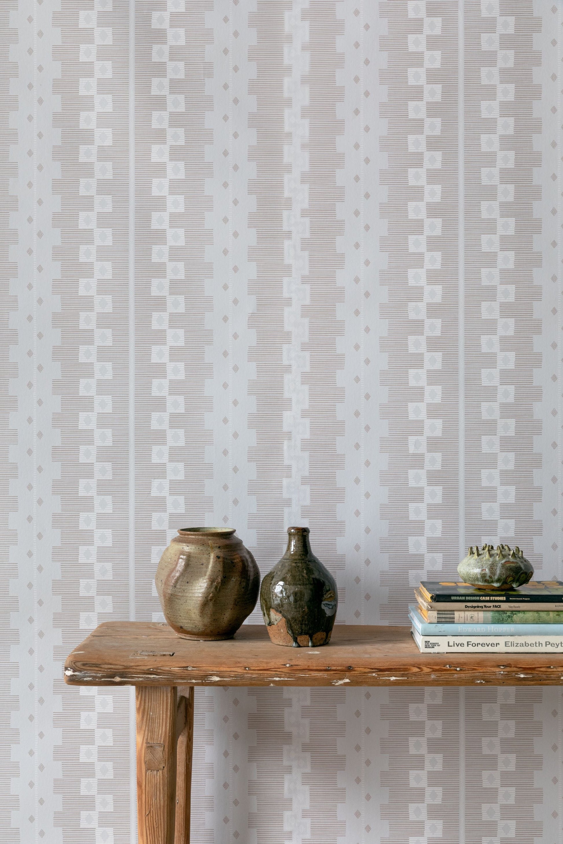 CUSCO travels across time and place, charting a course from ancient Inca textiles and Greek keys to the modern day painting of Cuban-American artist Carmen Herrera. Positive and negative space bring one another into balance, creating a series of geometric stripes. A design of soft brown and cream print on a mist of grey.