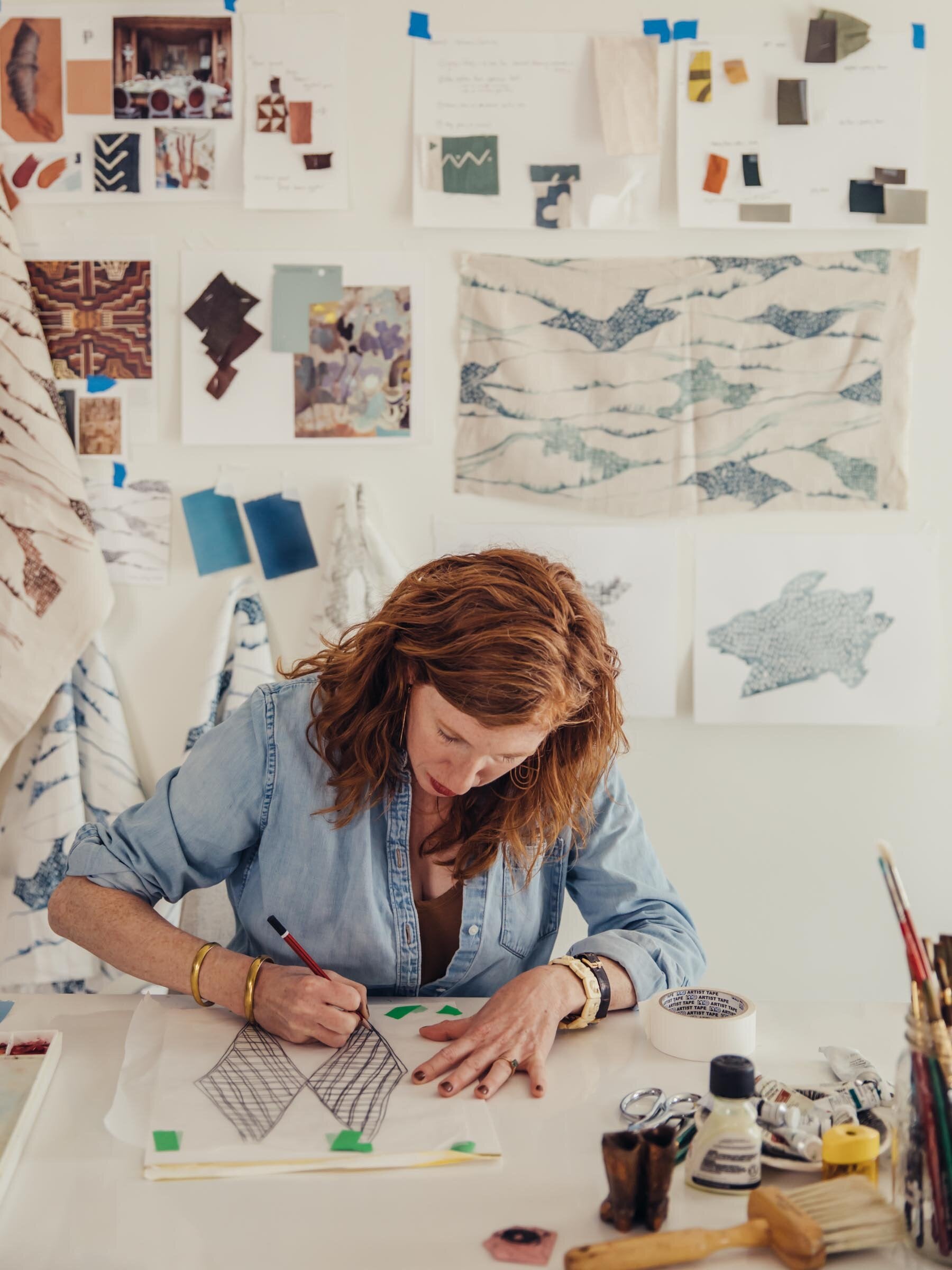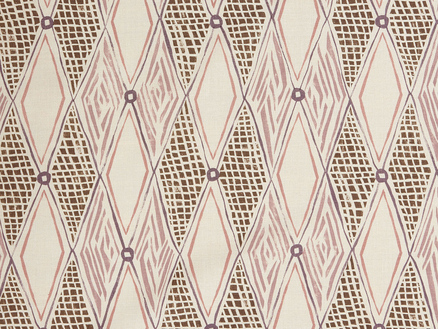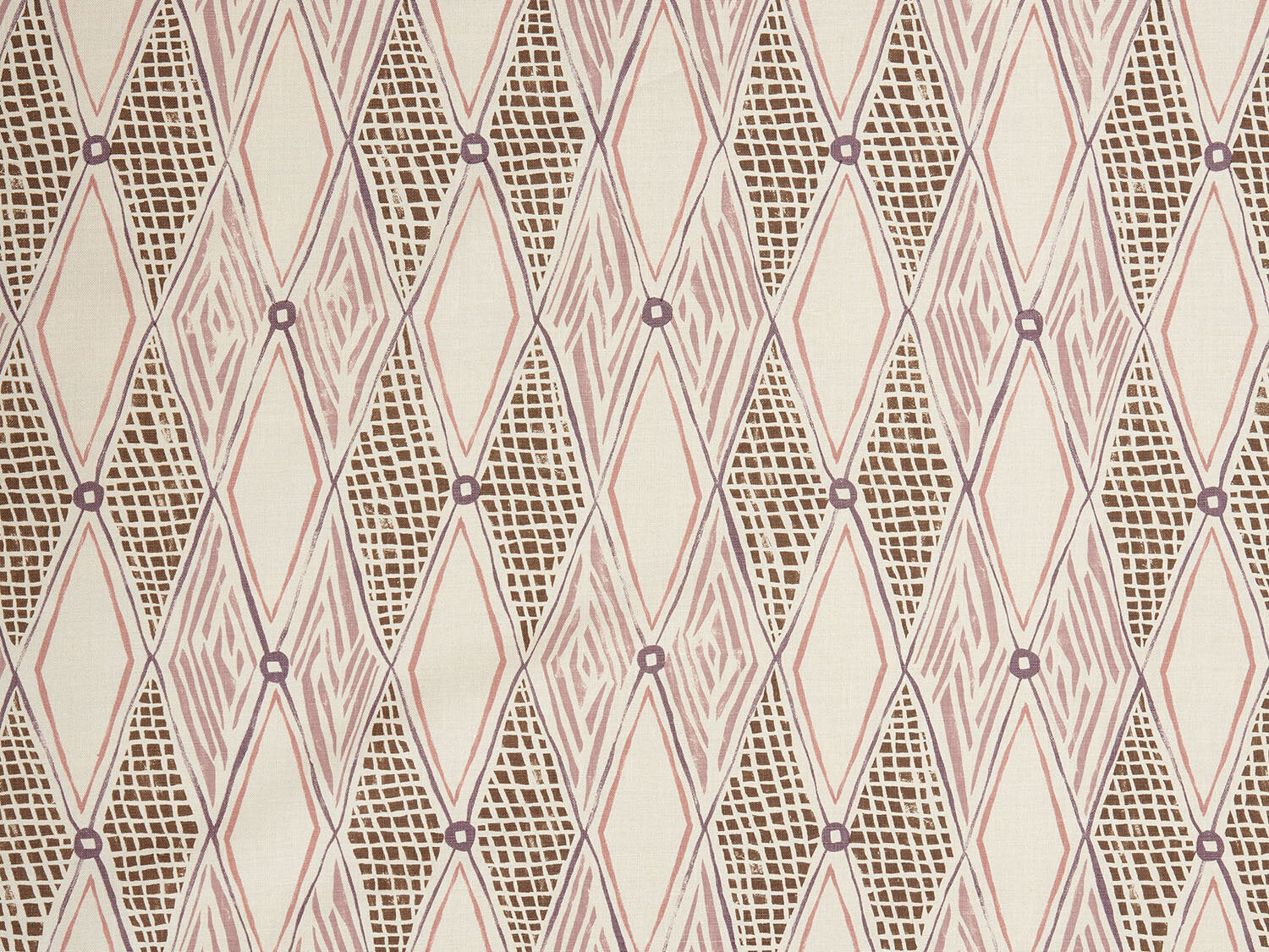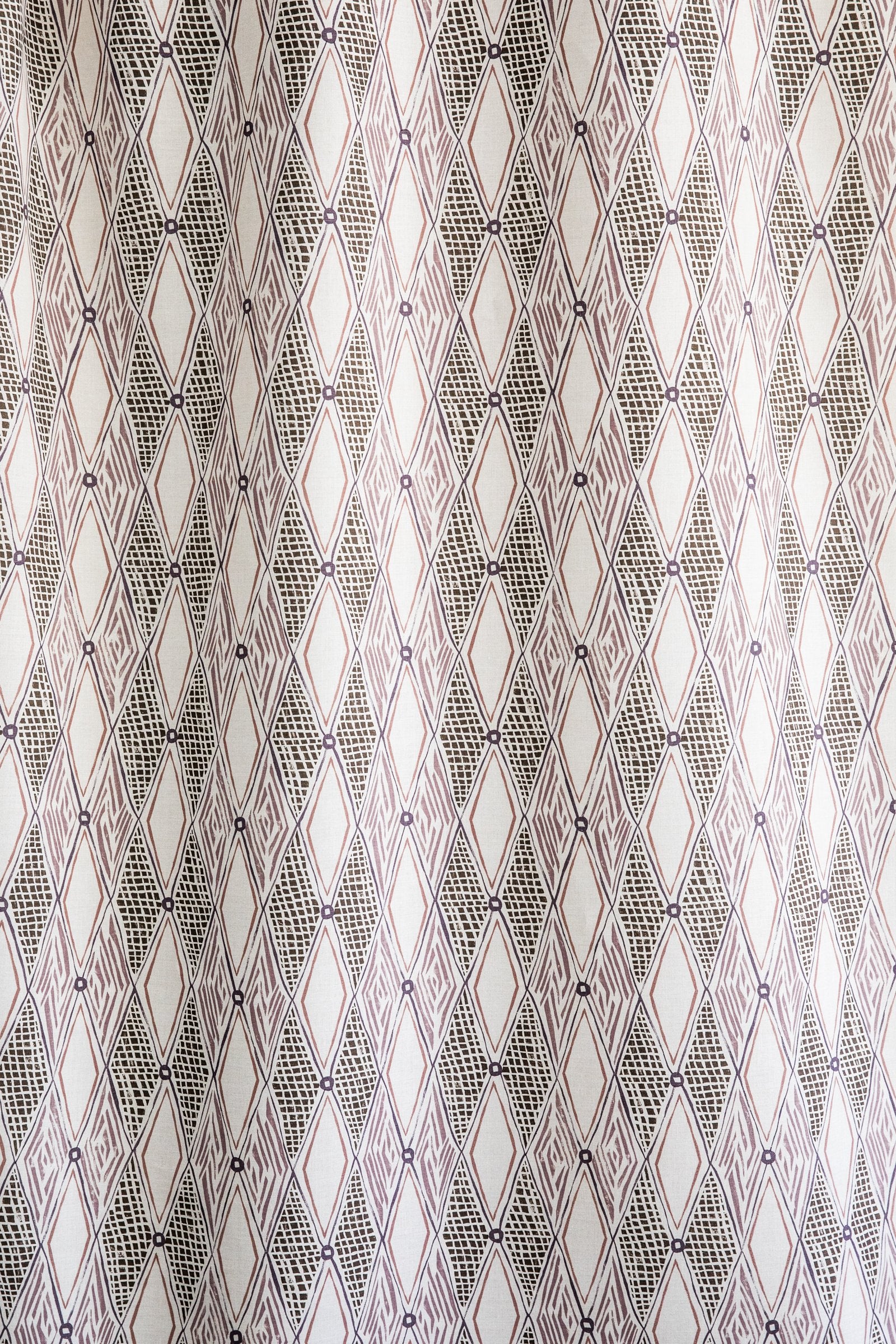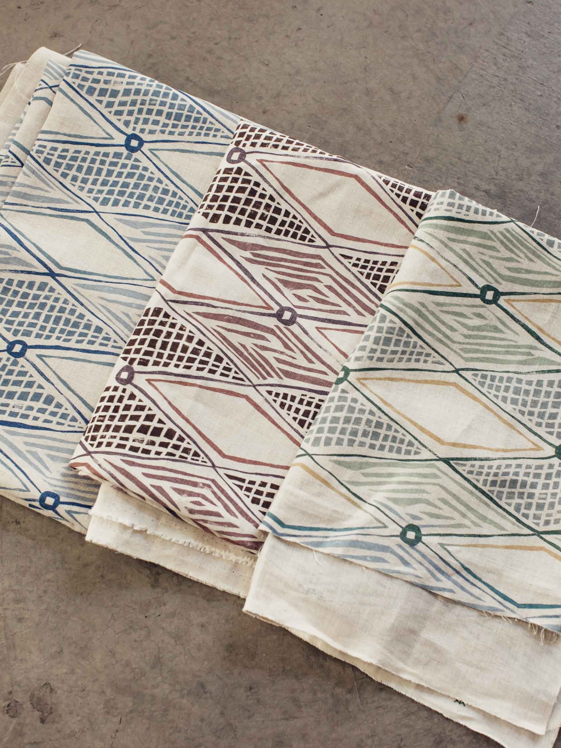 A montage is a composite work, created by assembling several pieces into a whole. This pattern started in the studio with a series of block prints, stripped down into high contrast lines, then layered together to create a large-scale motif. Hand drawn diamonds and lines build on one another, constructing an undulating lattice of screen-printed shapes.