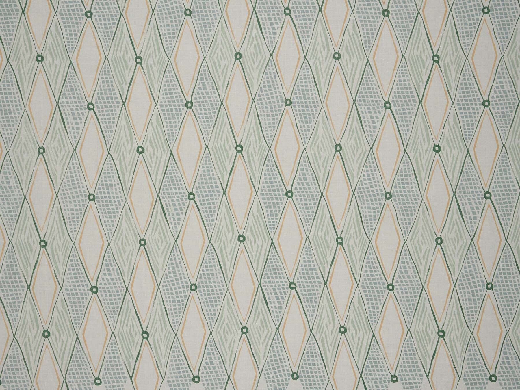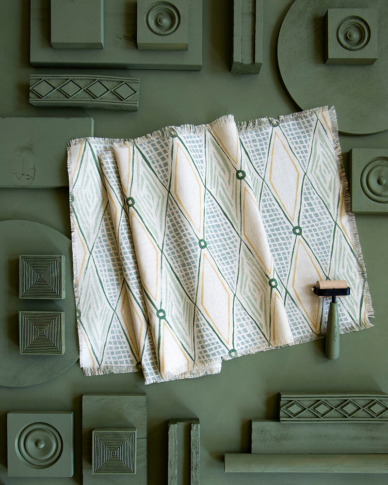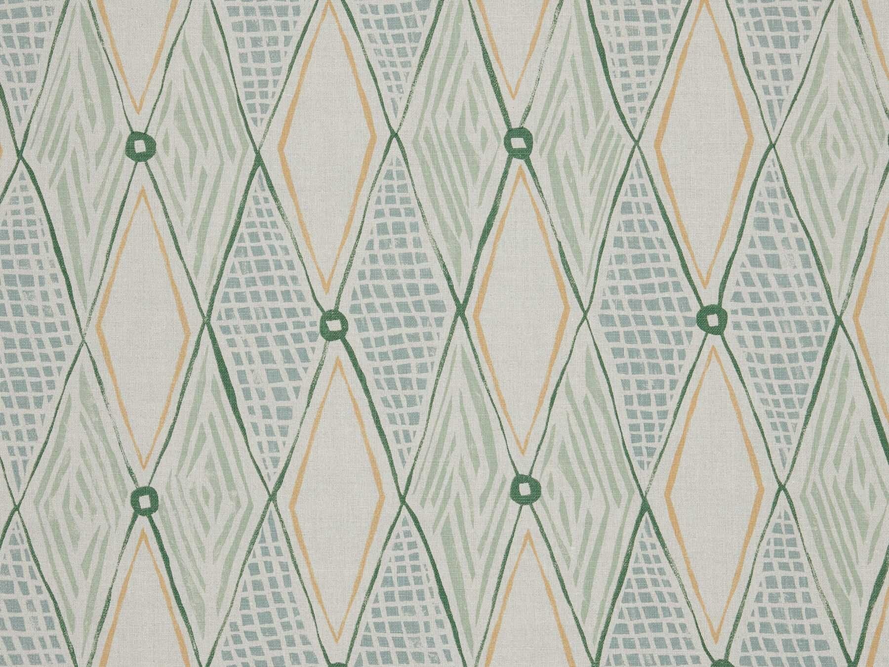 A montage is a composite work, created by assembling several pieces into a whole. This pattern started in the studio with a series of block prints, stripped down into high contrast lines, then layered together to create a large-scale motif. Hand drawn diamonds and lines build on one another, constructing an undulating lattice of screen-printed shapes. Printed in shades of green on natural Belgian linen.