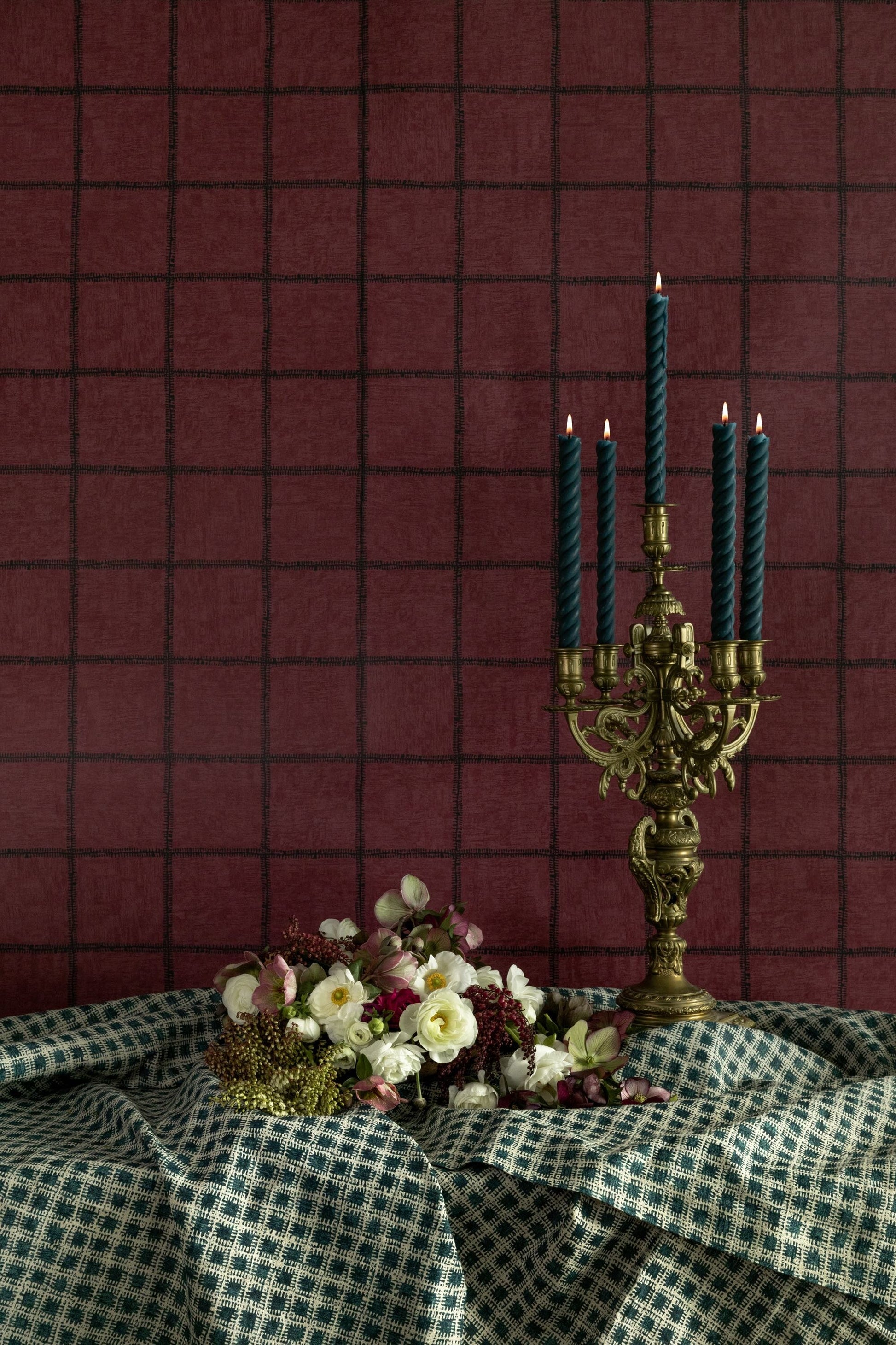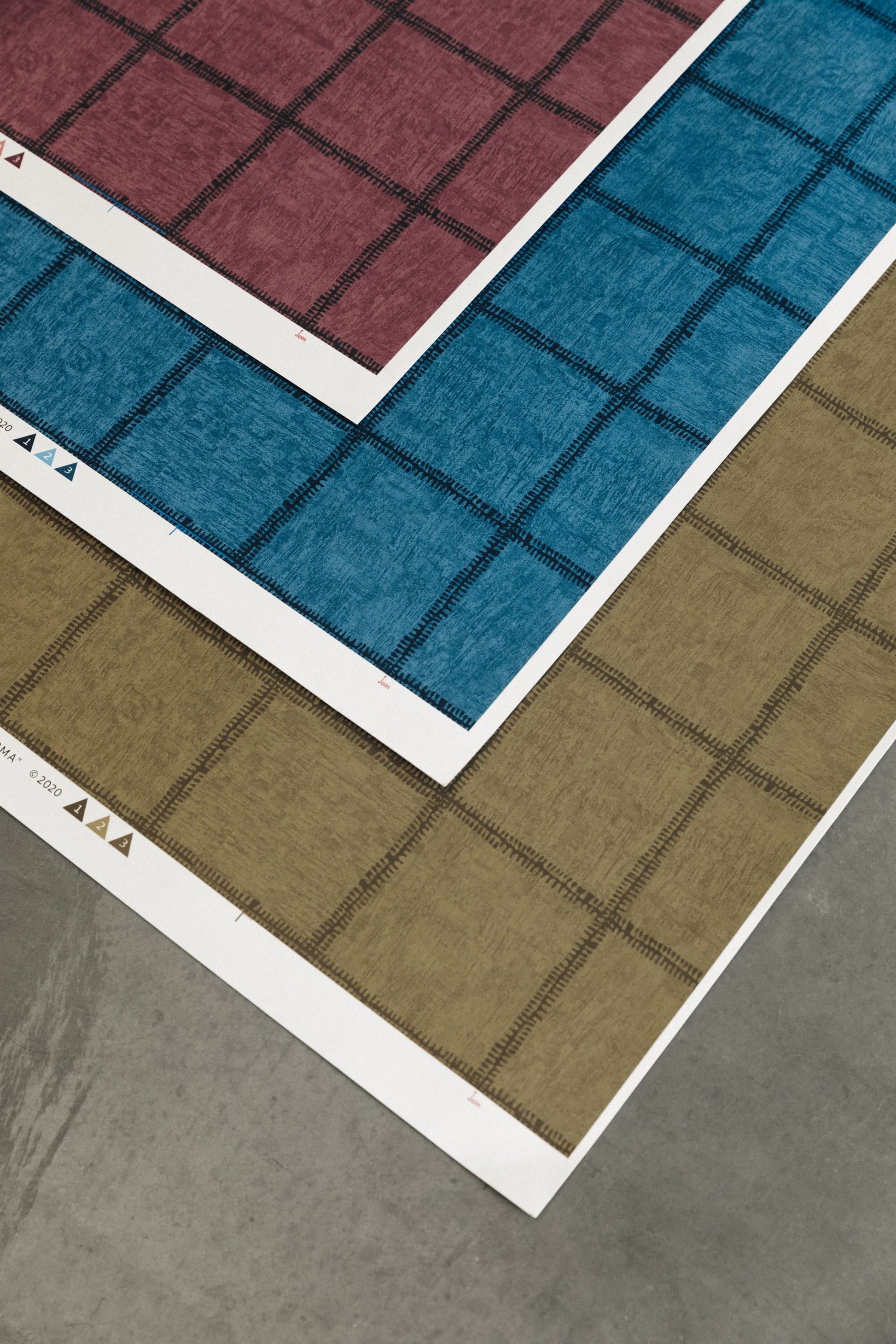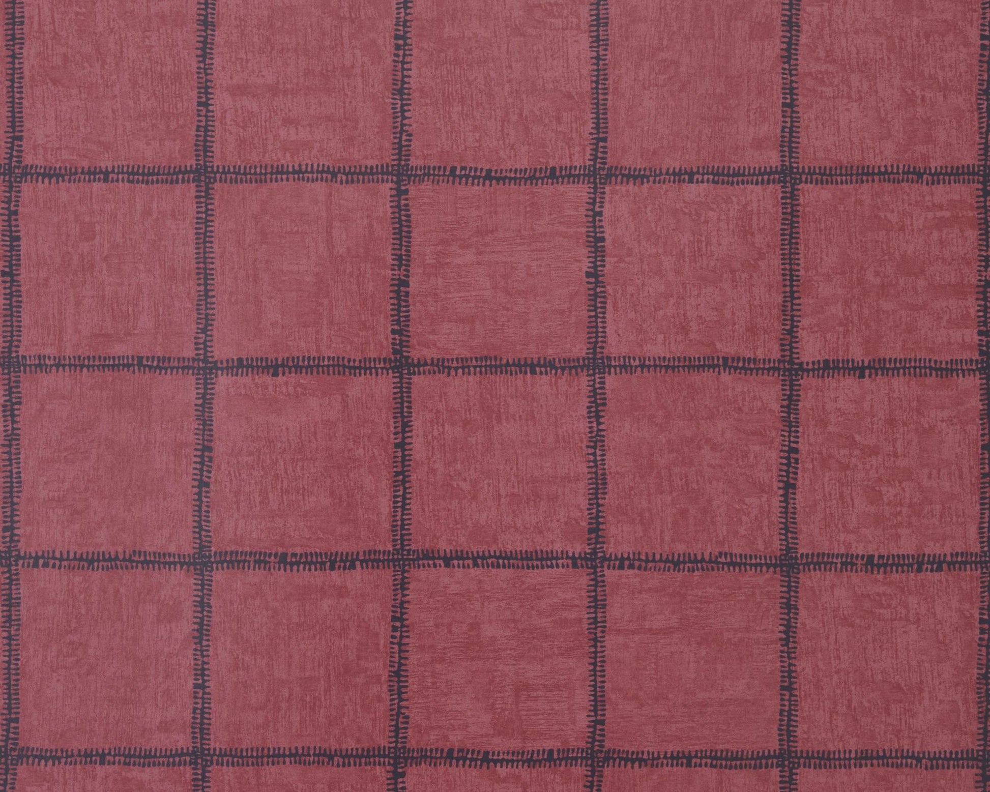 A windowpane print layered with depth and texture, ROMA references Italy’s frescoed walls. During a year spent painting abroad, Brook Perdigon studied the pigmented plaster that lines Rome’s palazzos and villas. In a palette of mineral hues, this wallcovering re-imagines an ancient art form for modern living. Printed in shades of of deep alizarin red with contrasting navy linework on vellum.
