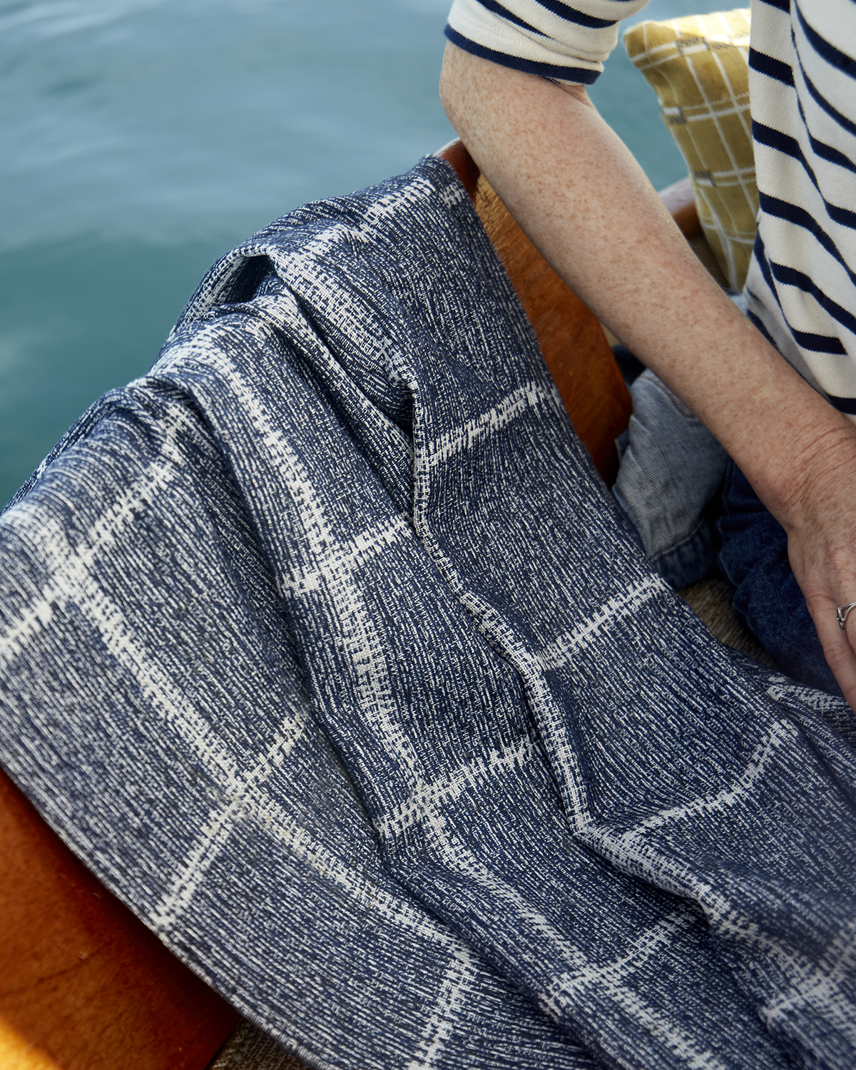 Originally inspired by Italian frescoes, we reworked this windowpane print by creating a texture in the weave through color. These subtle variations in shades across the ground give this performance textile the depth and tactile beauty of a wonderful woven, robust yet playful for the indoors and out. Woven in shades of aquatic blue out of 100% solution dyed acrylic.