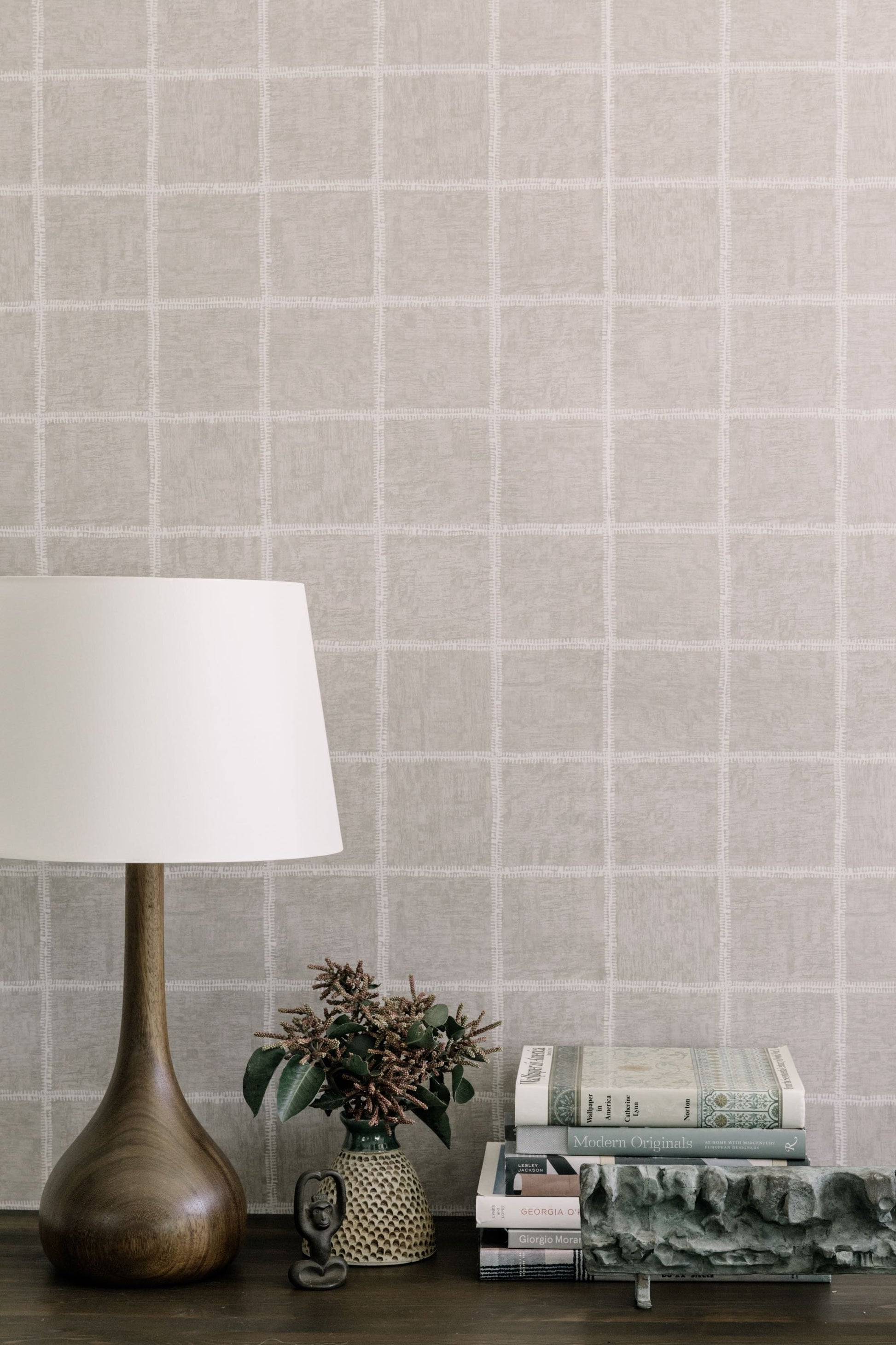 A windowpane print layered with depth and texture, ROMA references Italy’s frescoed walls. During a year spent painting abroad, Brook Perdigon studied the pigmented plaster that lines Rome’s palazzos and villas. In a palette of mineral hues, this wallcovering re-imagines an ancient art form for modern living. Printed as a warm stone neutral on vellum.