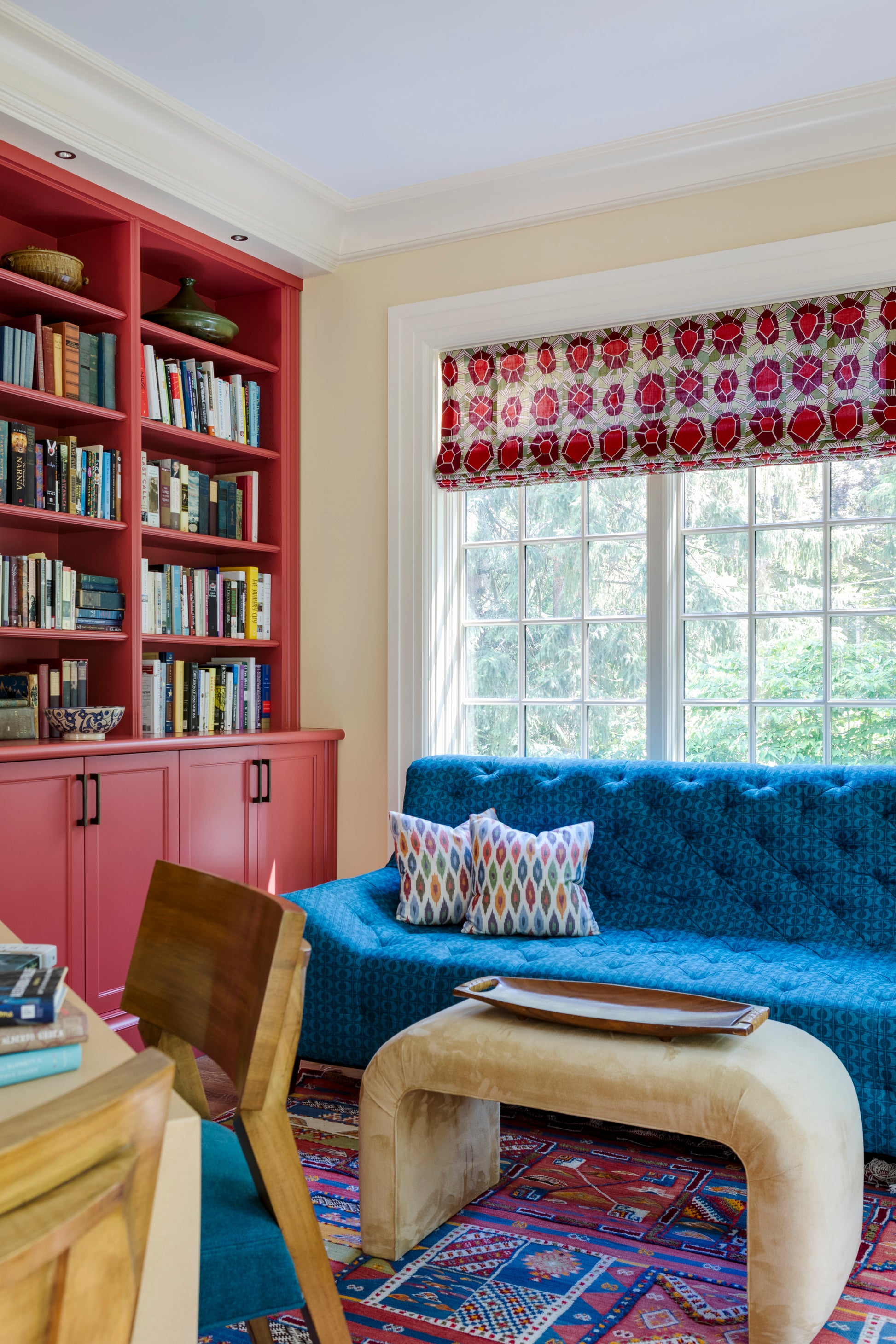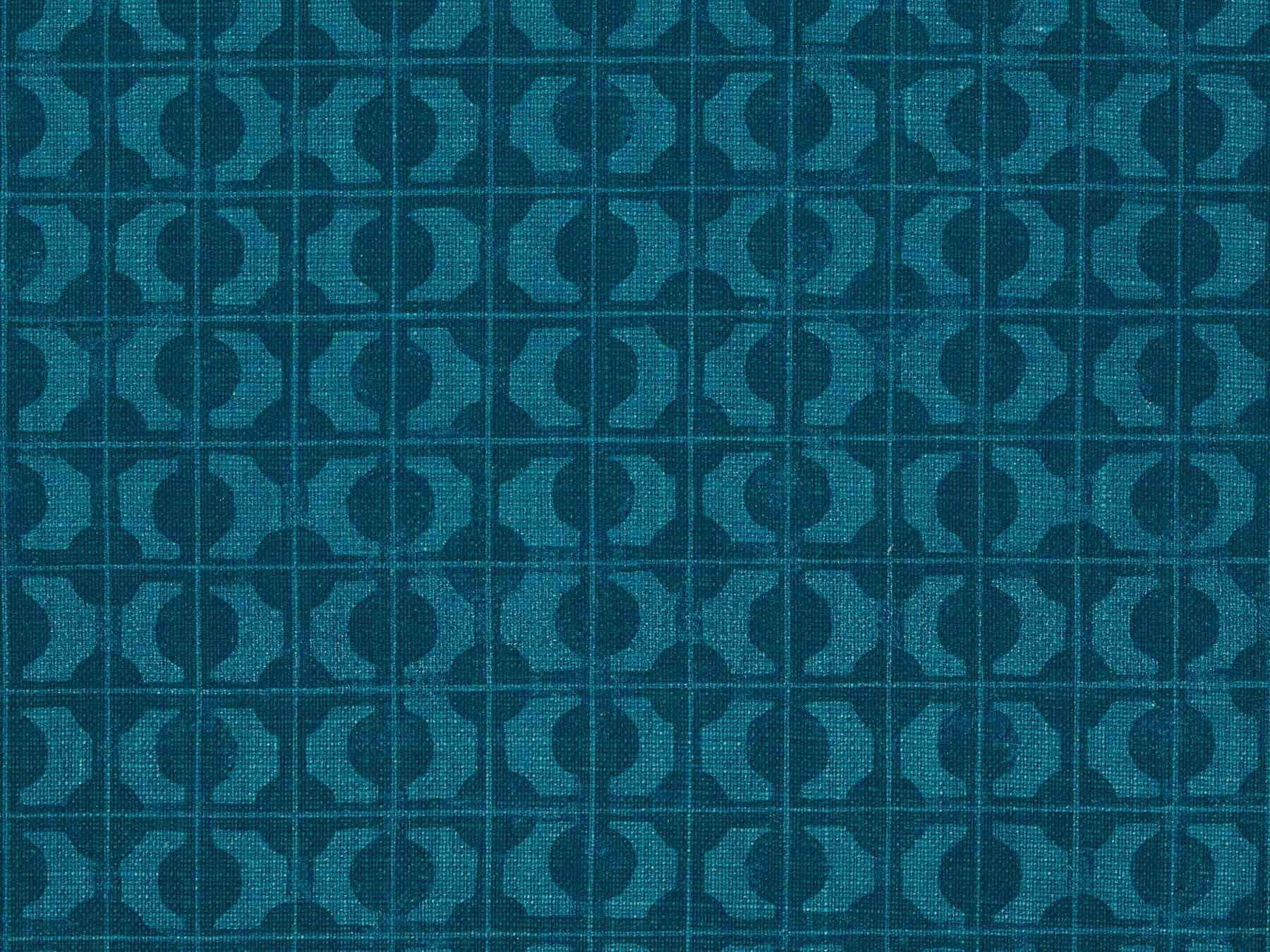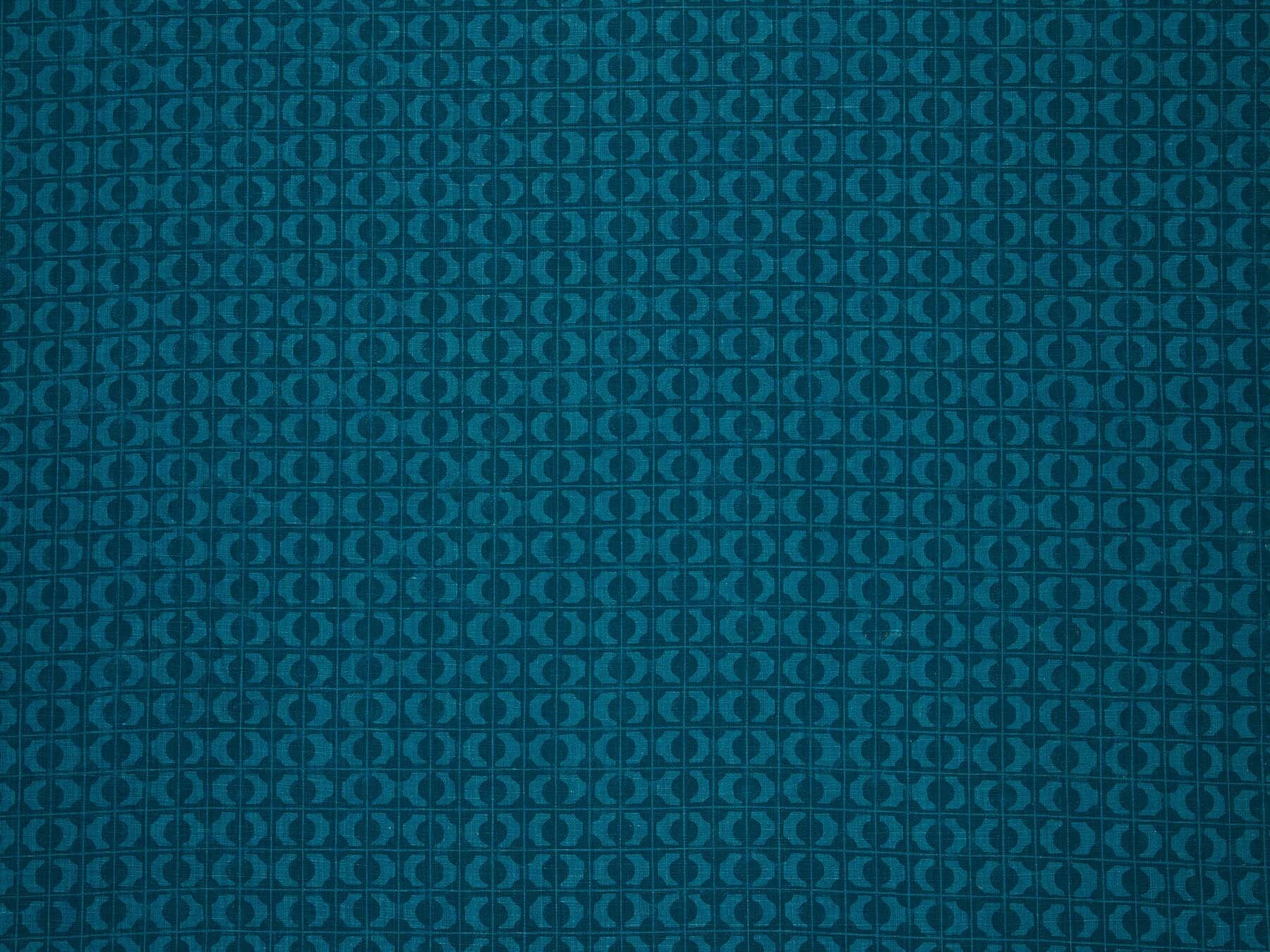 SETO is a series of intersections. East meets west, north meets south, ancient meets modern. Named for the inland sea that connects the islands of Japan, SETO both links lands together and creates vast distances. Hand-screened in two shades of deep teal on Belgian linen, the hand-blocked grid holds open and opaque forms in balance.