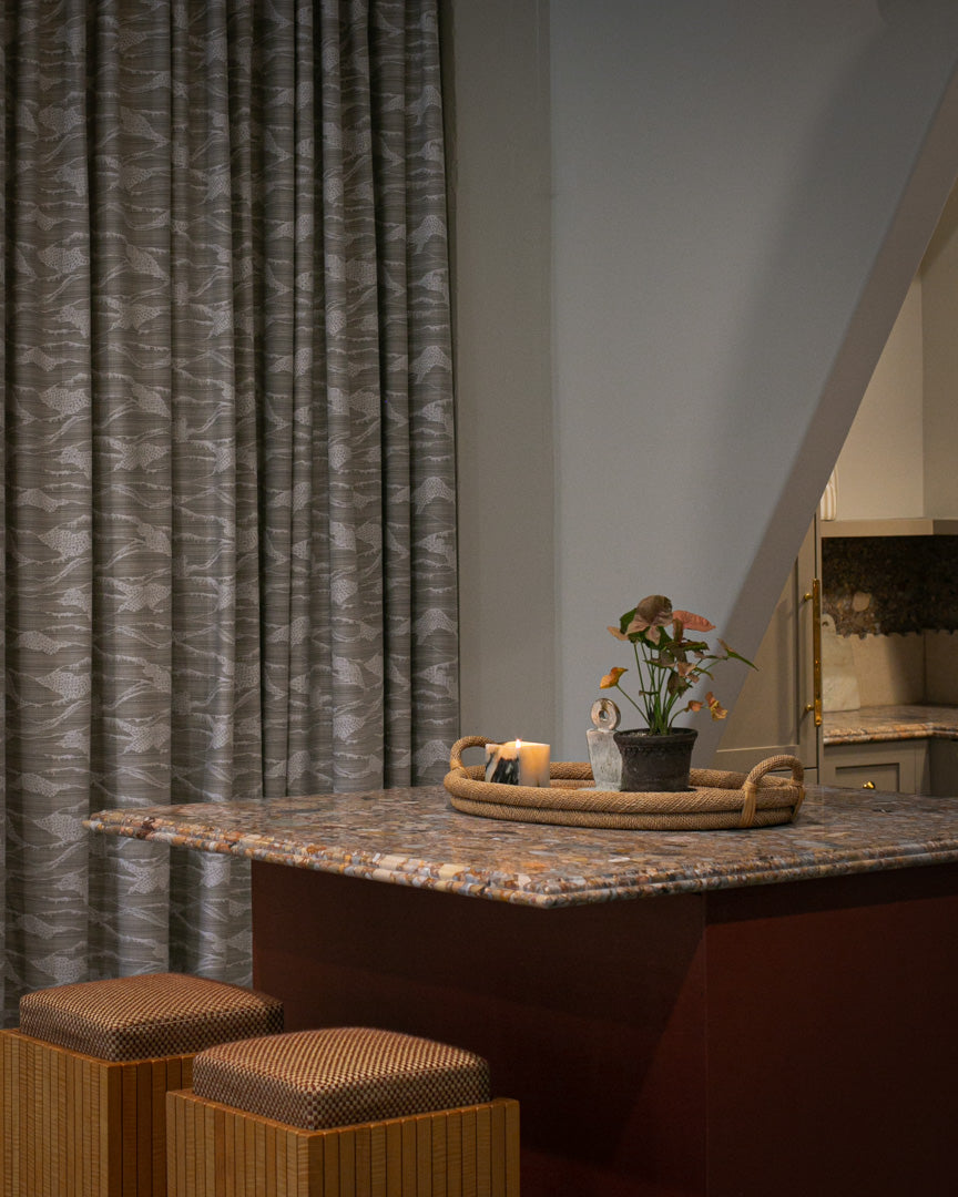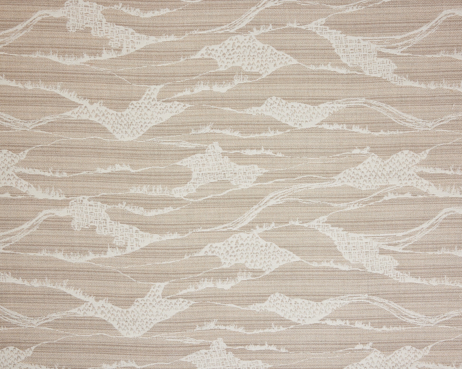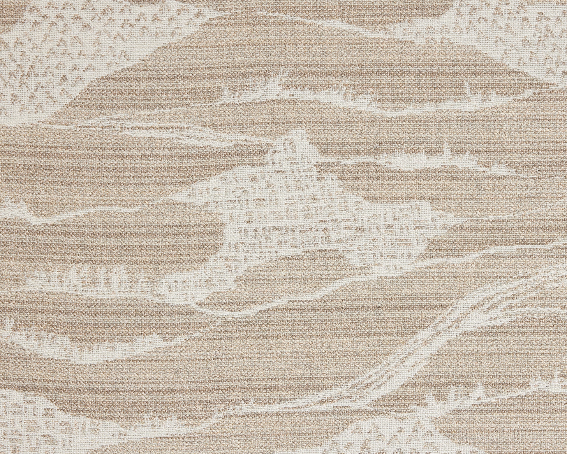 Our modern toile takes on a new perspective as a performance textile. It is reinterpreted with an inverted design, rendering the pattern in white set against a field of layered colors, lines, and textures. The dense landscape, at once spatial and sparse, is similar in formation to the original yet vastly different in composition. Woven in a stria of sand colored beiges out of 100% solution dyed acrylic.