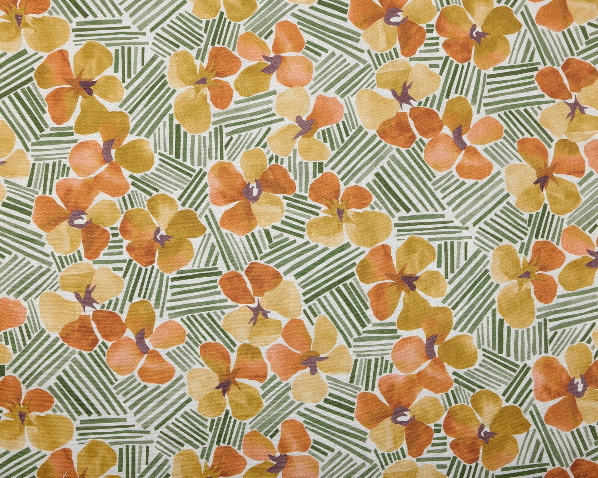 Inspired by a box of Brook’s childhood paintings of her mother’s pansy garden, Tropics is an evocative floral. Like memories resurfacing and finding their way back, the pattern is layered with depth and bright contrast. Consisting of loose textured linework and hand-painted cut-collage flowers, Tropics is imbued with playful, free-flowing movement — at once meandering and intersecting, emerging and receding, dancing and grounding. Printed in orange yellows and grass greens on oyster Irish linen, this print reimagines the whimsical floral.